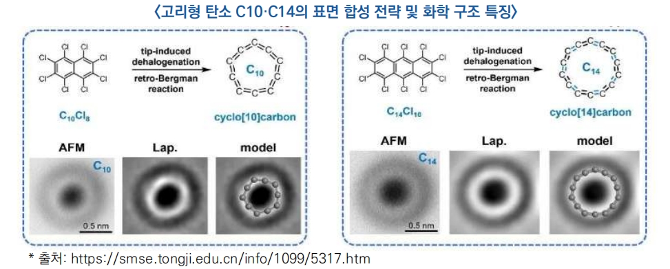 ○ 중국 둥제대학(同济大学) 재료과학·공정학부의 허위(许维) 교수 연구팀은 10개 또는 14개의 탄소 원자로 구성된 고리형 순수 탄소분자 소재를 성공적으로 합성