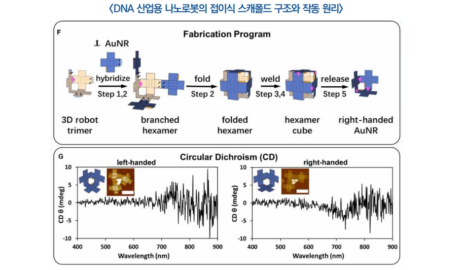 - 약 100nm 크기의 DNA 나노로봇은 온도와 자외선(UV)을 이용해 나노 크기의 부품을 조작 및 정렬할 수 있으며, 이를 정밀하게 ‘용접’하여 원하는 나노 구조 제조가 가능