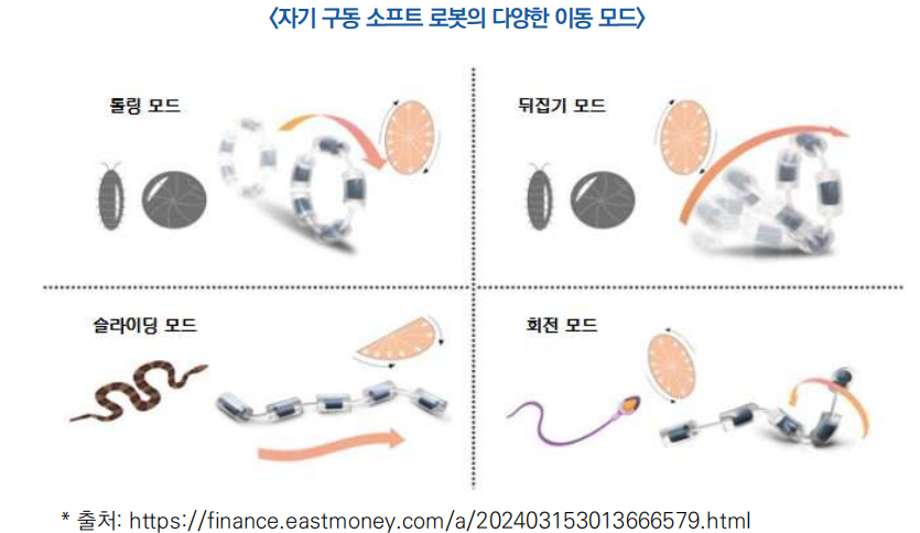 - 연구진은 나팔관 내부의 복잡한 환경 변화에 적응할 수 있는 자기 구동 방식의 소프트 로봇을 설계하여 원위치 프로그래밍과 이동 모드 전환을 수행하고 제어 가능한 약물 방출을 실현