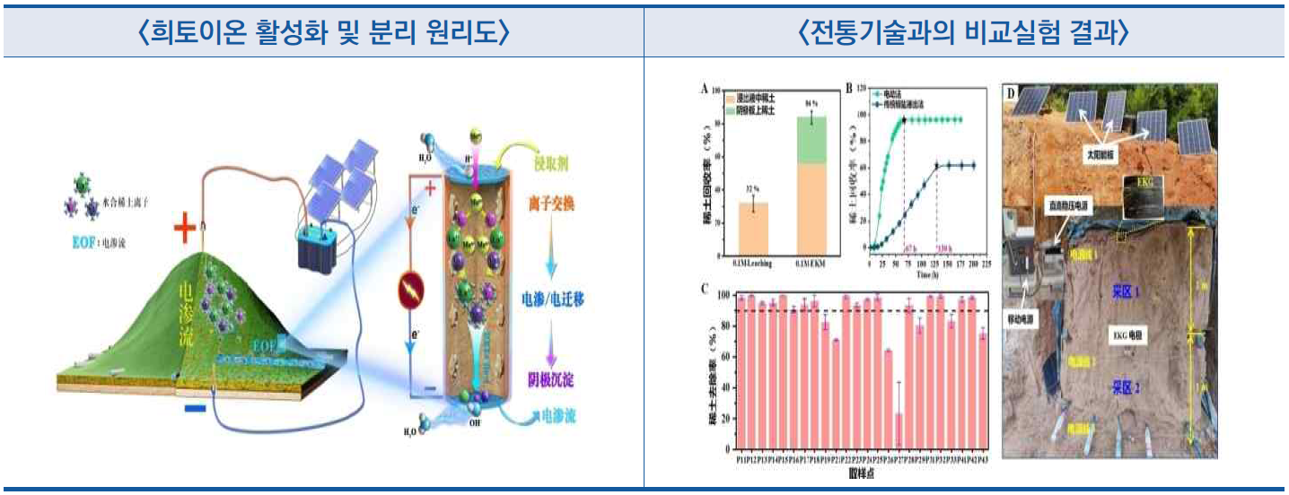 - 이 기술은 희토류 추출율이 높고, 침출제 사용량이 적어 차세대 이온흡착 희토류 채굴 기술로 사용될 전망이며, 기타 금속 광물자원(니켈광석, 풍화스칸듐광석 등) 채굴을 위한 기술지원도 가능