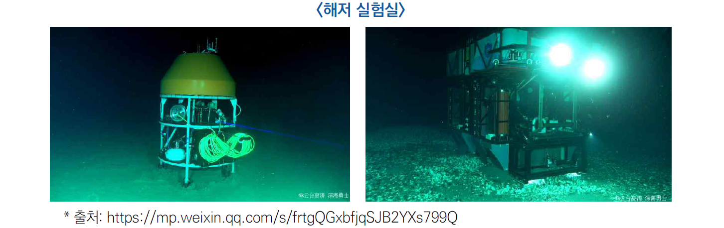 - 해저 실험실은 새로운 심해 시스템으로 대형 현장 과학 실험 스테이션의 성공적 설치로 향후 지능화 무인 실험, 탐측 및 정보전송시스템을 도입하여 심해 장주기 무인 과학탐사를 수행할 전망