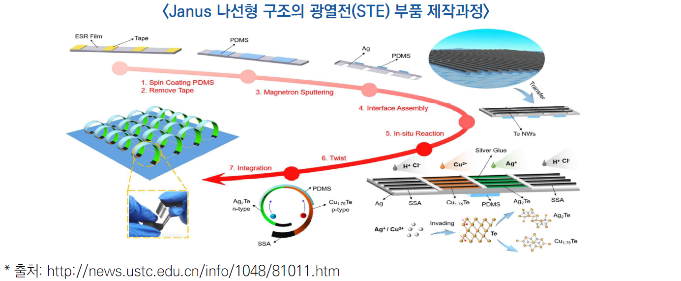○ 최근 중국과학기술대학 위수훙(俞书宏) 원사팀은 신형 플렉시블 Janus(양면형) 나선형 구조의 나노와이어 조립체 광열전(STE) 부품을 개발