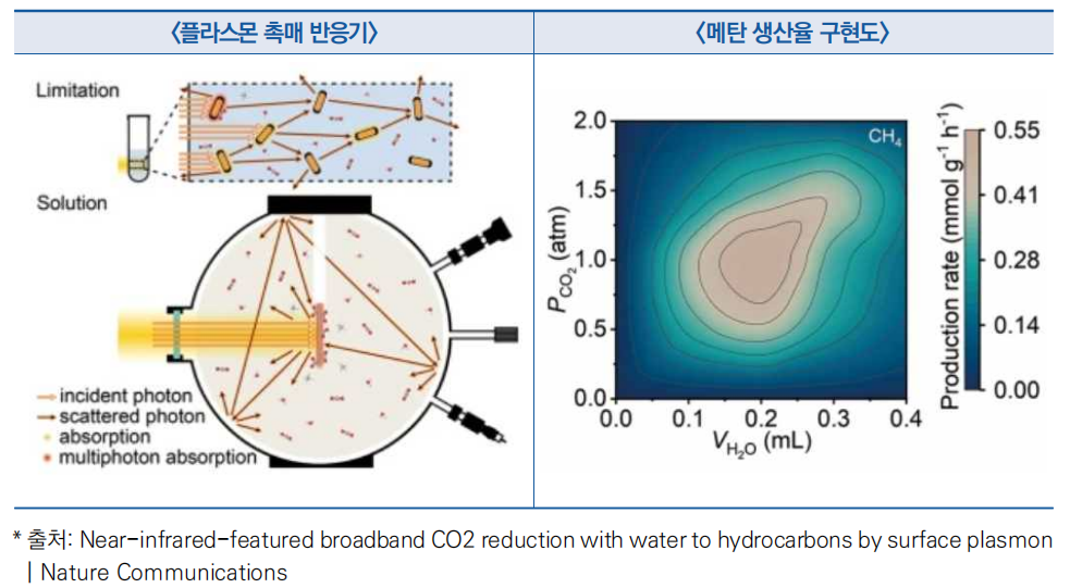 - 연구진이 개발한 플라스몬 소재는 독특한 계면 결합 상태의 직접적인 전자들뜸 메커니즘을 가짐으로써 가시광과 적외선 구역의 이산화탄소와 수증기를 메탄으로 합성 가능