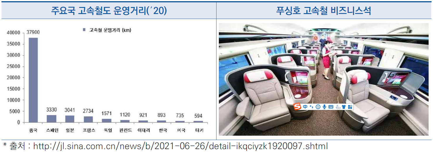 - ′20년도 중국의 고속철 운영 거리는 3.8만km로서 압도적인 세계 1위를 유지하였으며, 2위인 스페인보다 10배 이상의 격차를 보임