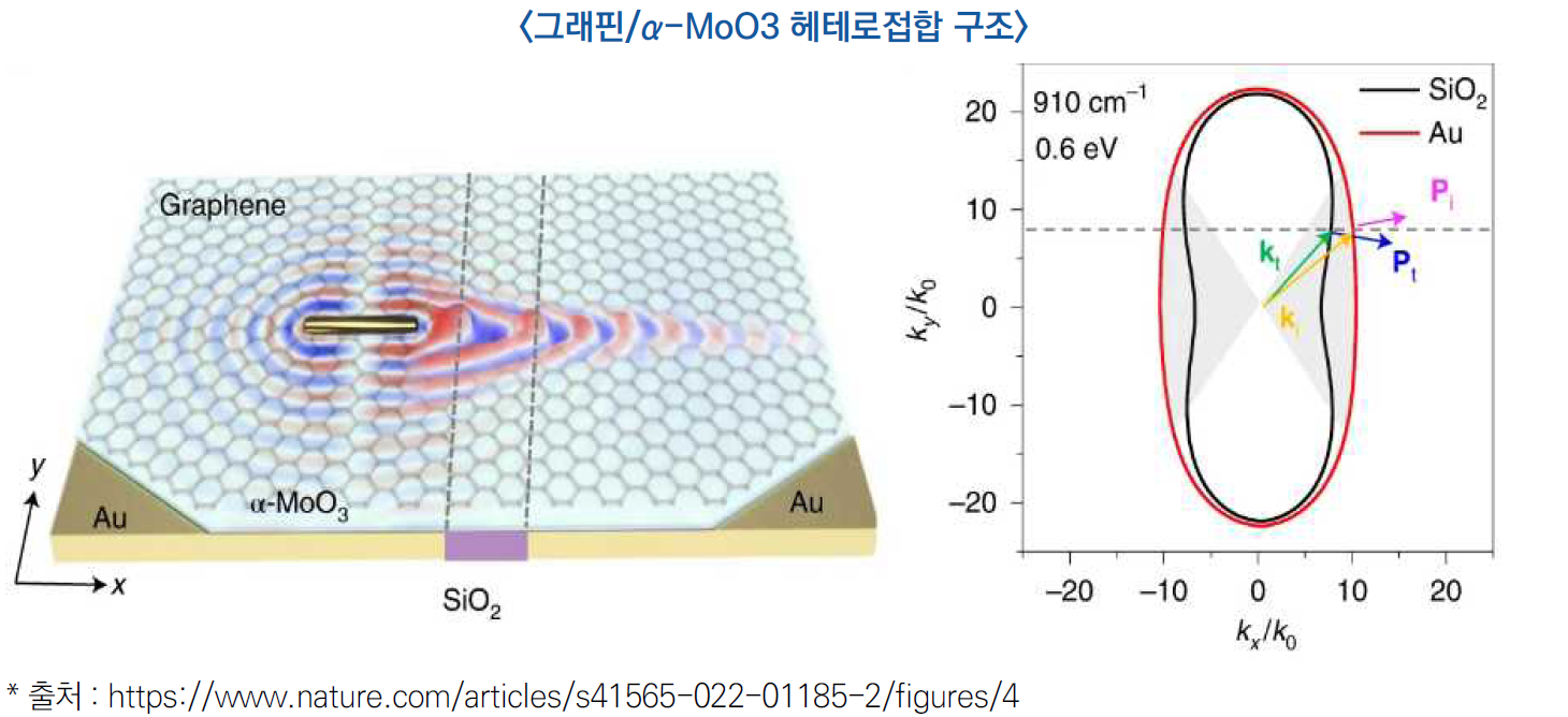 ○ 연구팀은 독창적인 그래핀/α-MoO3 헤테로접합을 이용해 10 미크론 파장의 적외선을 수십 나노미터 파장의 폴라리톤으로 압축해 소재 평면 위의 에너지 집중 및 직진 전송을 실현