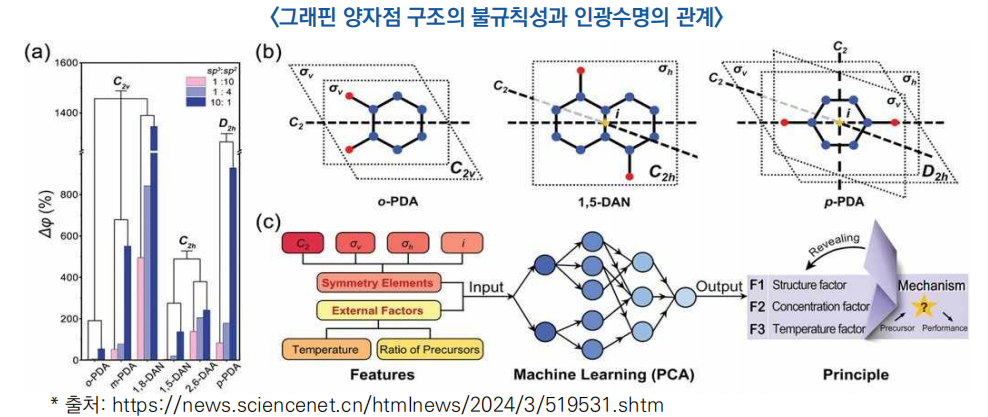 - 연구진은 그래프 컨볼루션 네트워크 분석을 통해 이상적인 모델에서 그래핀 양자점의 구조적 공극률·가변성을 평가하고 그 구조의 불규칙성과 인광수명 사이의 선형 관계 발견