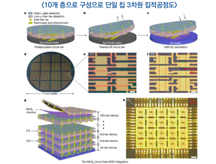 - 위 조립식 회로 층을 120°C의 저온에서 반도체 웨이퍼에 집적함으로써 10개 층으로 구성된 반데르 발스(VanDer Waals) 층상조직 형태의 단일 칩 3차원 시스템을 구현함