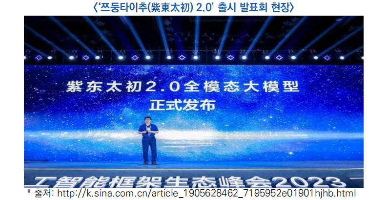 - ‘쯔둥타이추(紫東太初) 2.0’은 영상, 센서 신호, 3D 포인트 클라우드 등 인식능력을 업그레이드하고, 다중 모드 패킷 인지 코딩, 디코딩 및 전체 모드 인지 등 핵심기술 확보