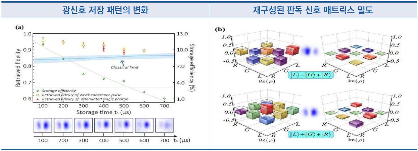 ○ 각각 2개의 3차원 궤도각 운동량 중첩상태를 연구를 통해 저장시간이 확장될수록 메모리 기능 효율이 더욱 높아지는 점을 발견하여 다중모드 광자 상태 장시간 저장이 가능해짐