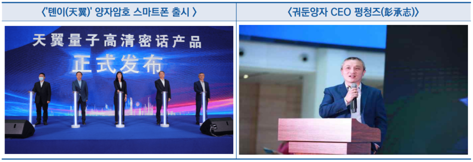 - 지난 ′21년 1월 양사는 합작 투자 회사인 중덴신양자기술(中电信量子科技)을 설립하고 국내 최초의 양자보안 기술이 탑재된 '톈이양자 비화통신(天翼量子密话)' 스마트폰을 출시