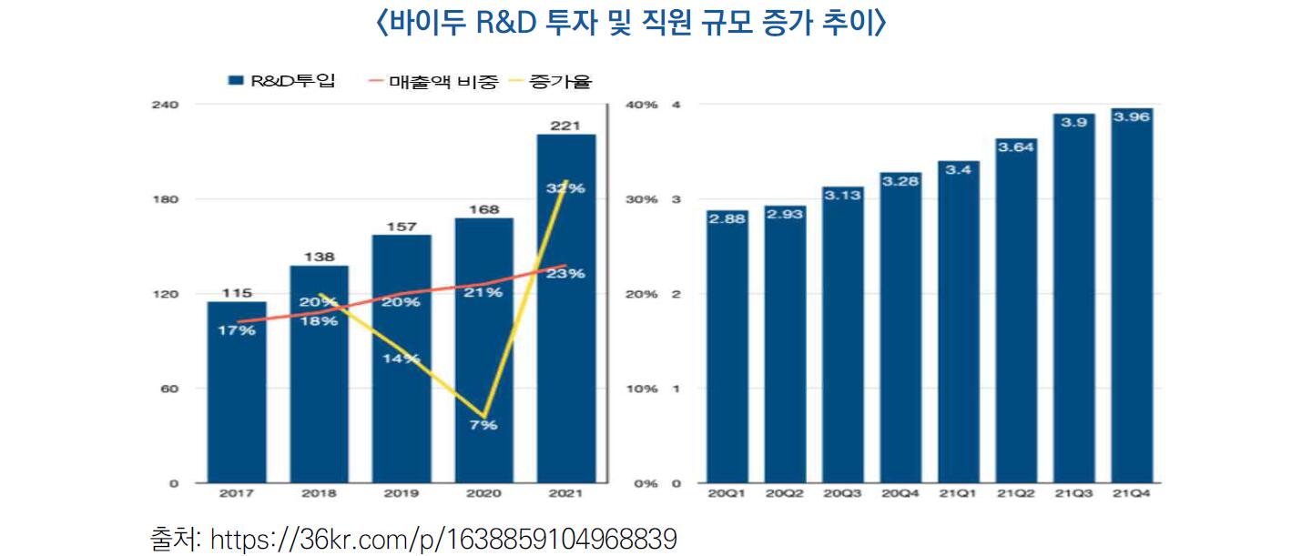 - 바이두의 재무보고서에 따르면 2021년 바이두의 핵심 R&D 투자는 221억 위안으로 전체 수입의 23%를 차지