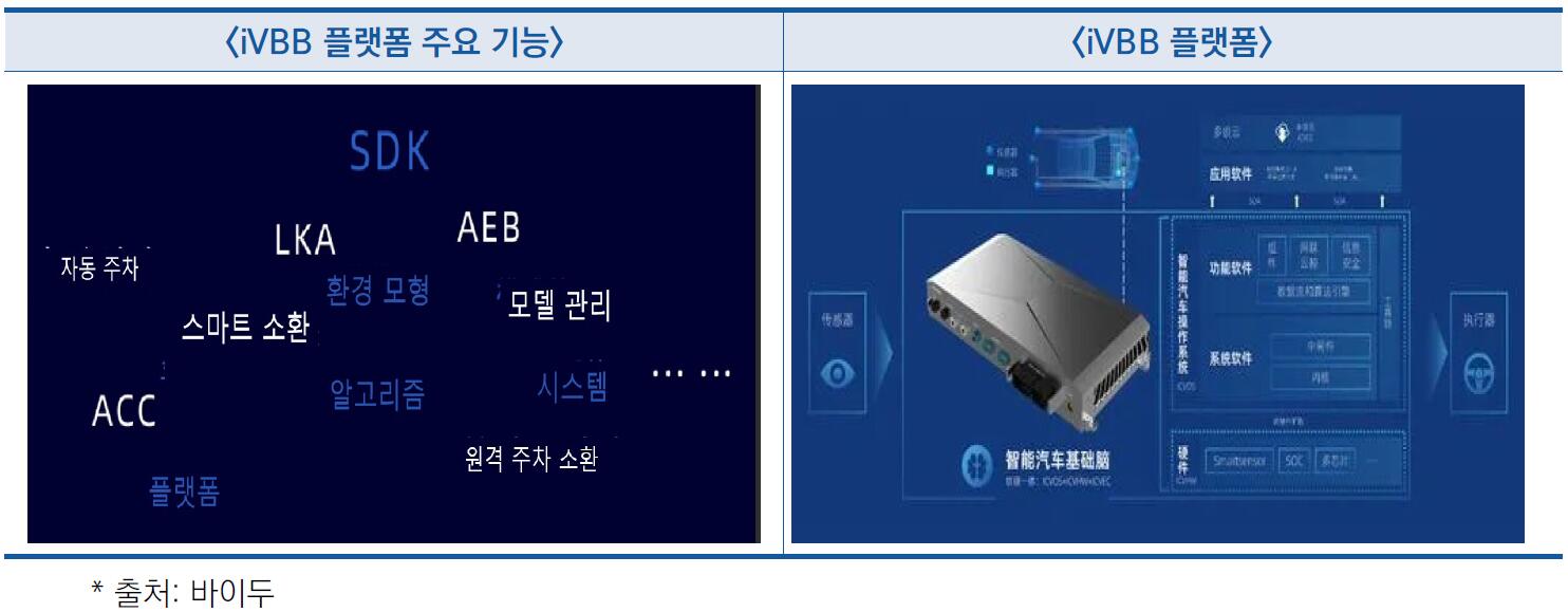 - ′21년 11월 개발한 iVBB 2.0 버전은 주요 기능인 스마트 자동차 제어 시스템(ICVOS), 도메인 컨트롤러(ICVHW), 자동차 클라우드 협동 기초 소프트웨어(ICVEC) 업그레이드 외에 처음으로 정보·데이터 보안 시스템인 ICVSEC을 출시