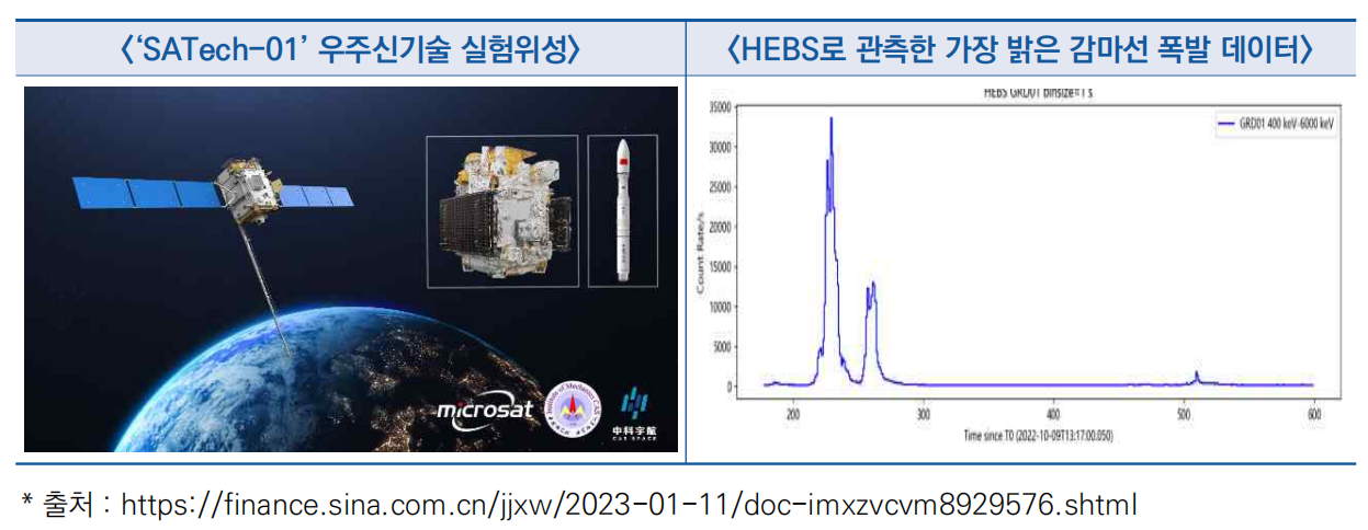 ○ 중국과학원은 ‘SATech-01’ 우주 신기술 실험 위성에 탑재된 HEBS 고에너지 폭발 탐측기로 역대 가장 밝은 감마선 폭발(GRB 221009A)을 관측