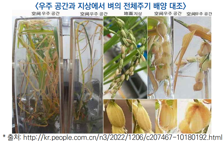- 이는 기존의 애기장대·유채·완두콩·밀에 이어 세계 최초로 우주에서 벼의 ‘종자에서 종자까지’의 전체 생명주기에 걸친 배양 실험을 완성하여 우주 작물의 효율적인 생산에 새로운 아이디어와 실험적 증거 제공