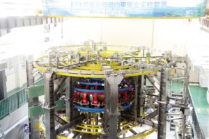 ![]() 최근, 중국 첫 대형 역자기장 핀치 자기 밀폐형 핵융합(reversed field pinch magnetic confinement fusion) 실험 장치[KTX, “커다이환(科大一環)”으로 약칭]가 중국과학기술대학교에서 최종 설치와 실험가동을 완성했고 정상적 운행에 들어갔다. 이 장치의 전체 지름은 8미터이고, 자기장은 7,000가우스, 플라즈마 전류는 1조 암페어, 전자 온도는 600만 도, 방전 시간은 100밀리초에 달한다. 사진은 대형 역자기장 핀치 자기밀폐형 핵융합 실험 장치이다. 정보출처 : http://www.wokeji.com/kbjh/zxbd_10031/201511/t20151104_1866767.shtml |
