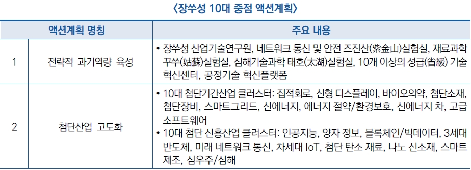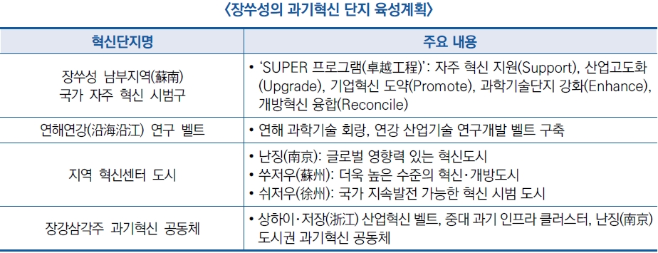 ● (혁신단지) 장쑤성 남부지역(蘇南) 국가 자주 혁신 시범구, 연해연강(沿海沿江) 연구 벨트, 지역 혁신센터 도시, 장강삼각주 과기혁신 공동체 심층 융합 등 육성계획 발표