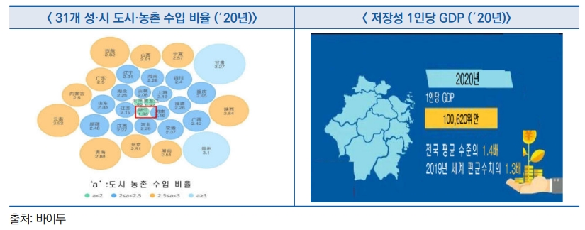 – 저장성의 도농간 소득 격차는 1.96배 규모로 톈진(天津), 헤이룽장(黑龙江) 에 이어 3번째로 낮은 수치임