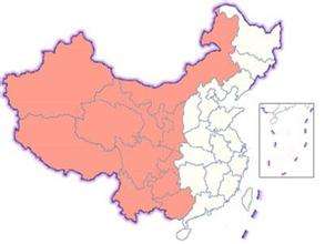 중국 서부지역에는 충칭(重慶), 쓰촨(四川), 구이저우(貴州), 윈난(雲南), 시짱(西藏), 산시(陝西), 간쑤(甘肅), 칭하이(靑海), 닝샤(寧夏), 신쟝(新疆), 네이멍구(內蒙古), 광시(廣西) 등 12개 성·시·자치구가 포함된다. 면적은 687만 ㎢로서 중국 전체 면적의 72%이다. 인구는 2015년 기준 중국 전체 인구의 27% 점유하고 상주인구 도시화율은 48.7%이며 총생산액은 14조 5000억 위안으로서 국내총생산(GDP)의 약 20.1% 차지한다.