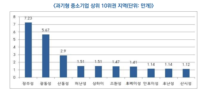 – 장쑤성의 과기형 중소기업 수는 7만 2,300개로 압도적인 우위를 차지하고, 광동성이 5만 6,700개로 2위, 산동성이 2만 9,000개로 3위를 각각 기록