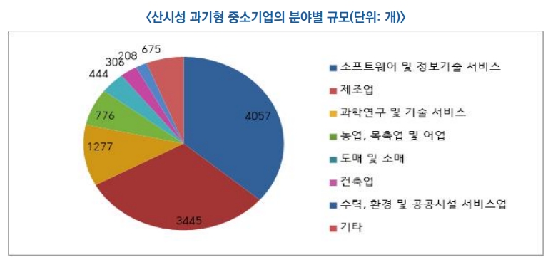 – 분야별로 보면 소프트웨어 및 정보기술 서비스 분야 기업이 4,057개로 전체에서 차지하는 비중이 36.26%이며, 제조업 분야 기업이 3,445개로 전체 중 30.79%를 차지