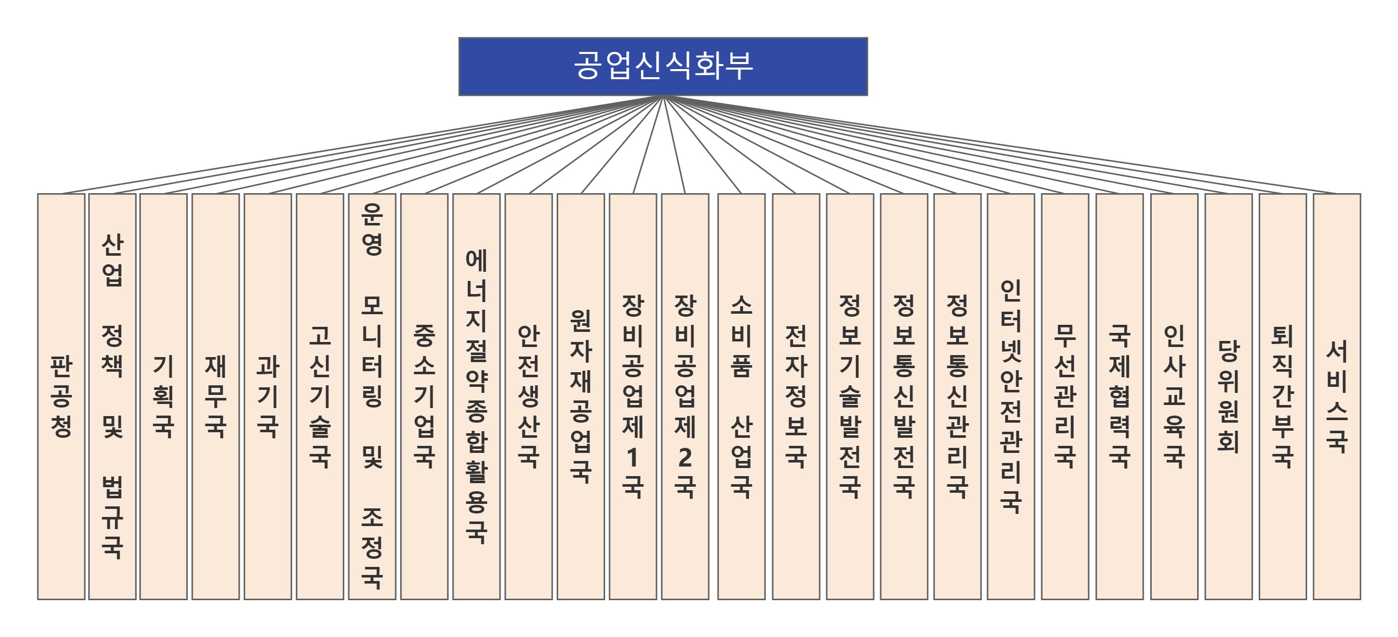ㅇ 산업 정책 및 법규국: 산업, 정보통신산업 정책 제안, 산업구조 조정, 산업 통합발전 및 관리혁신 등 중대 발전 전략 수립