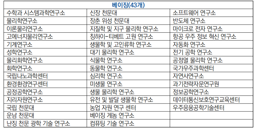 - 베이징 내 대학 : 고에너지물리연구소, 수학·시스템과학연구소, 반도체연구소, 베이징게놈연구소 등 43개 보유