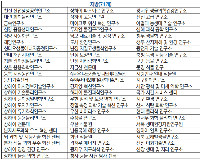 ![]() - 지방 소재 대학 : 허폐이 물질과학연구소, 창춘광학정물리연구소, 대롄화학물리연구소 등 지방 소재 연구소 71개 운영