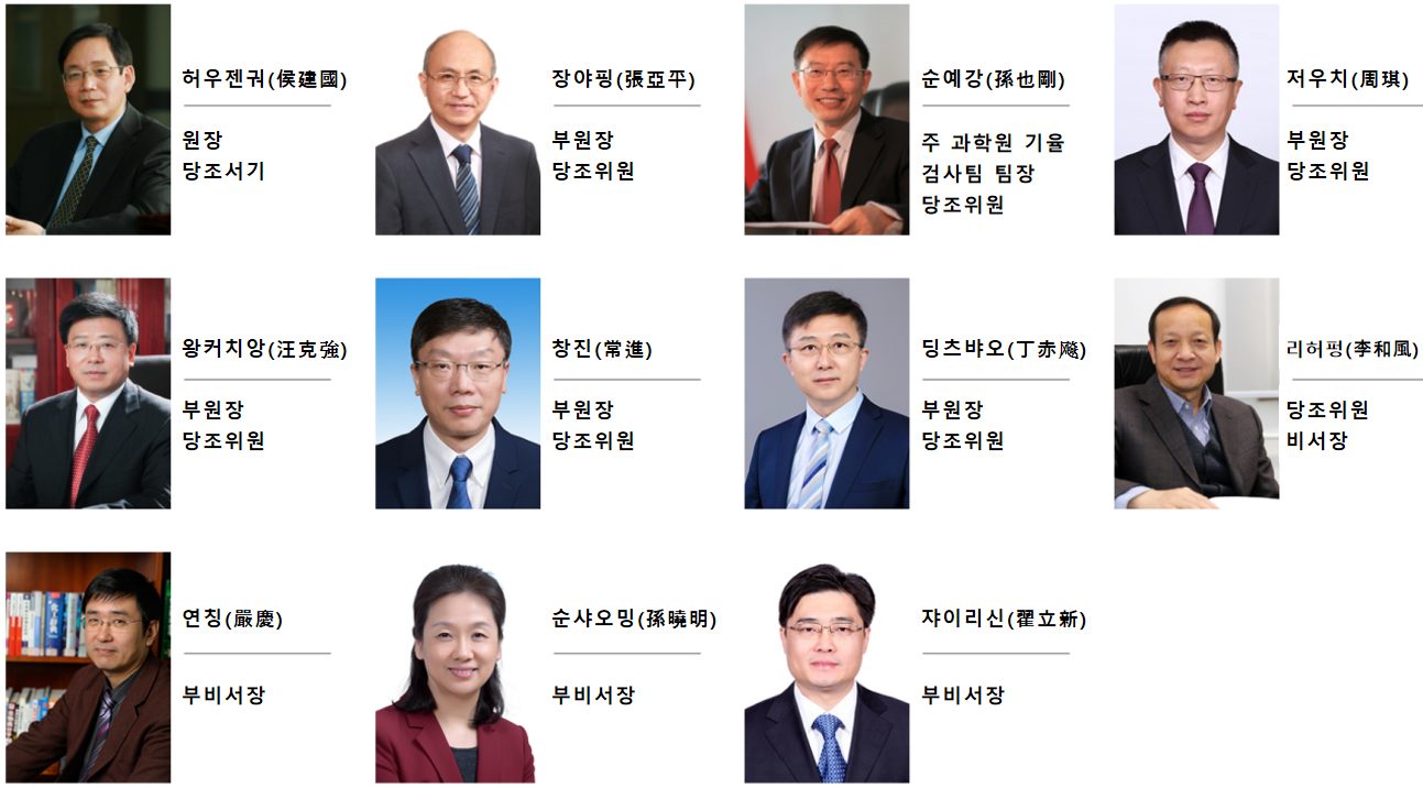 ㅇ (원장 및 당조서기) 허우젠궈(侯建國,1959), 중국과학기술대학 구조성분분석센터 주임(‘97), 중국과학원 원사(‘03), 중국과학기술대학 교장(‘08), 중국과학원 부원장(‘18), 중국과학원 원장(‘20)등 역임